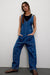 Features: Denim fabrication, rigid feel, low scoop neckline, seam detail throughout, oversized patch pockets, drop-crotch harem-style legs, low back with adjustable shoulder straps