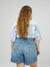 Golden thread and an antique brass button provide the ideal complement for the blue denim.