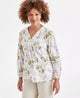 Go retro glam in a pretty printed blouse from Celebrity Pink with seamed bust details, picot trim, and a peplum hem.