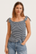 This is a stylish off-the-shoulder striped top from Mango. The top features a classic black and white horizontal stripe pattern, giving it a chic and timeless look. It has an asymmetrical draped neckline with tied shoulder details, adding a playful and feminine touch. The fabric appears to be soft and stretchy, making it comfortable to wear. This top is perfect for casual outfits and can be paired with jeans, skirts, or shorts for a fashionable yet relaxed look