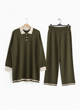 Elevate your loungewear and casual style with this perfectly coordinated two-piece knit set. Combining ultimate comfort with sophisticated details, this set features an oversized polo top and flattering wide-leg trousers, perfect for effortless, all-day wear.