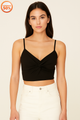 A black, short-sleeved crop top on a mannequin. The top features a prominent white lace-up detail down the front, with a deep V-neckline. The sleeves appear to be short and slightly ruffled at the shoulders.