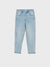 Mom jeans, mom fit, elasticated waist, zip and button fastening, four pockets, roll-up legs, subtle wash effect.