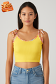 Embrace a touch of edgy style with this black ribbed crop tank top, featuring a striking butterfly graphic print. The top showcases a vibrant butterfly design, with one wing in warm orange and yellow tones and the other in cool blue and white hues, giving it a unique artistic flair. The ribbed fabric offers a comfortable, form-fitting silhouette, while the cropped length and subtly scalloped or cut-out hem add a modern, trendy touch. Perfect for casual wear, concerts, or making a statement.