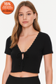 This cropped white t-shirt features playful pink trims and a cheerful front design with a rainbow, butterfly, and the word “Happy” surrounded by stars and dots. It’s a fun, youthful piece that radiates positive vibes and colorful charm.