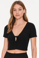 This cropped white t-shirt features playful pink trims and a cheerful front design with a rainbow, butterfly, and the word “Happy” surrounded by stars and dots. It’s a fun, youthful piece that radiates positive vibes and colorful charm.