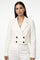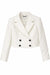 This is a cropped, double-breasted blazer in an elegant off-white or cream color. It features a tailored fit with structured shoulders, a wide lapel collar, and long sleeves. The blazer is fastened with four contrasting black buttons, adding a stylish contrast to the light fabric. The material appears to have a slight sheen, suggesting a refined and polished look. This piece is perfect for formal or semi-formal occasions, offering a modern and chic silhouette