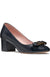 A prim branded bow puts a polished finish on the patent-leather cap toe of this almond-toe pump set on a walkable block heel.