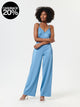 A textured woven romper featuring a straight-cut neckline and back, self-tie tassel closures at the cami straps and front, frayed ruffled trim, slanted front pockets, and an elasticized waist.