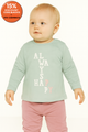 This is a charming baby sweatshirt in a soft teal shade. It features a cozy round neckline and long sleeves, making it perfect for cooler days. The front showcases an adorable aviation-themed print with a small airplane, clouds, trees, and a floral detail, along with the words "Flight" for a playful touch. The ribbed cuffs and hem provide a snug fit, and the snap buttons on the shoulder ensure easy dressing. Ideal for everyday wear, this sweatshirt combines style and comfort for little ones.