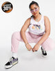 a pair of light beige or off-white jogger-style pants designed for children. The pants feature an elastic waistband with a ruffled effect, adding a stylish touch. They also have a subtle seam running down the front of each leg, giving them a structured look. The cuffs at the bottom of the legs are also elasticated for a snug fit. There is a small text detail on the lower part of one leg, which reads "HI,IT'S ME". The material looks soft and comfortable, likely a cotton or cotton-blend fabric, making these joggers ideal for casual wear.