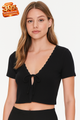 This cropped white t-shirt features playful pink trims and a cheerful front design with a rainbow, butterfly, and the word “Happy” surrounded by stars and dots. It’s a fun, youthful piece that radiates positive vibes and colorful charm.