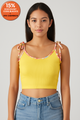 A bright yellow, form-fitting mini dress displayed on a white mannequin. The dress features thin spaghetti straps and a sweetheart neckline with ruching or gathering at the bust. A prominent cut-out is visible directly below the bust, revealing a portion of the torso. The fabric appears to have a textured or slightly crinkled finish. The hemline of the dress is just above the knees and has a subtle wavy or ruffled edge.