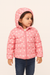 - Quilted puffer styling; heart-print pattern; packable into included bag