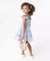 A little girl's dress in an all-over seersucker and floral schiffli with smocked bodice, flutter sleeves.