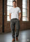 Details: The pants are paired with a simple white crewneck t-shirt and light brown leather work boots, reinforcing their casual, hard-wearing aesthetic.