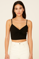 A black, short-sleeved crop top on a mannequin. The top features a prominent white lace-up detail down the front, with a deep V-neckline. The sleeves appear to be short and slightly ruffled at the shoulders.
