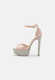 - Patterned rhinestones at straps; rhinestone trim at welt