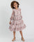 A little girl's party dress in an all-over floral chiffon with tiered cinched ruffles throughout and pleated center bodice.