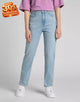 The Lee Retro Women's Jeans are a super cool flared jean. A modern take on a vintage classic, the Breese features a high waist and a slim fit from hip to knee that flares out at the hem. The pockets sit higher up for a flattering rear view. This eco-friendly denim has been crafted from recycled fabrics that have been combined with stretch yarn for added comfort and finished into a beautiful, stretchy mid-weight jean. The clean, uncomplicated light aesthetic features subtle distressed areas where washing reveals just a portion of the grain, highlighting the denim's versatility. Subtle yellow stitching and brass metal rivets and button complete the stylish look. Iconic leather patch at back waistband. Zip closure. Pockets at front, two pockets with Lee's signature stitching at back. Flared fit - High rise - Sustainable dyeing.