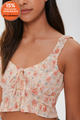 A woven cami featuring an allover ditsy floral print, V-neckline, tiered flounce construction, and a self-tie at the chest, a straight-cut back, and adjustable straps.