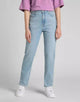 The Lee Retro Women's Jeans are a super cool flared jean. A modern take on a vintage classic, the Breese features a high waist and a slim fit from hip to knee that flares out at the hem. The pockets sit higher up for a flattering rear view. This eco-friendly denim has been crafted from recycled fabrics that have been combined with stretch yarn for added comfort and finished into a beautiful, stretchy mid-weight jean. The clean, uncomplicated light aesthetic features subtle distressed areas where washing reveals just a portion of the grain, highlighting the denim's versatility. Subtle yellow stitching and brass metal rivets and button complete the stylish look. Iconic leather patch at back waistband. Zip closure. Pockets at front, two pockets with Lee's signature stitching at back. Flared fit - High rise - Sustainable dyeing.