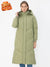 - Long hooded puffer coat with concealed zip-and-snap placket, two side-entry pockets