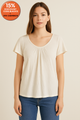 - Subtle wrap-style front that gathers at the hem, creating a draped effect