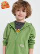 Features: Fastened (e.g., zip-up), includes a hood, and features pockets.