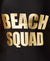 Scoop neckline; metallic "Beach Squad" graphic at front
