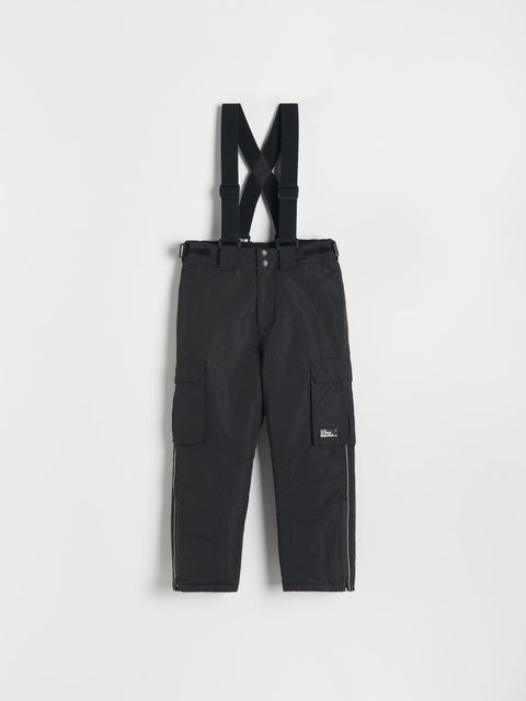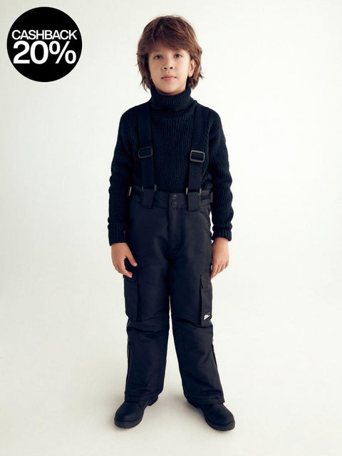 Reserved Boy's Black Snow pants With Shoulder Straps snap fastening cargo pockets to the sides waterproof fabric decorative patch reflective elements Fabric I: 100% POLYESTER Fabric II: 100% POLYESTER Fabric III: 100% POLYESTER...