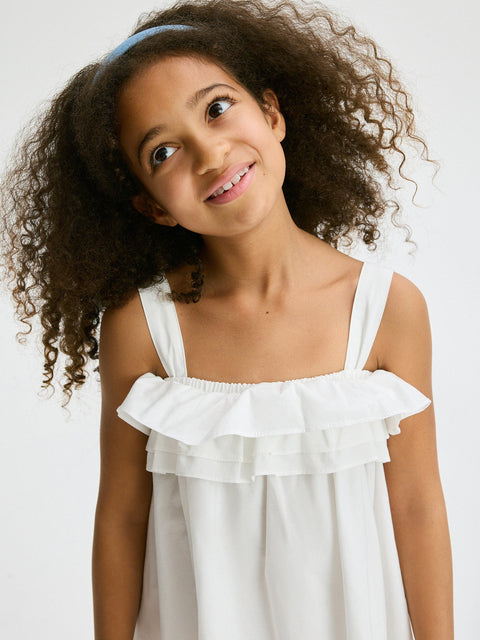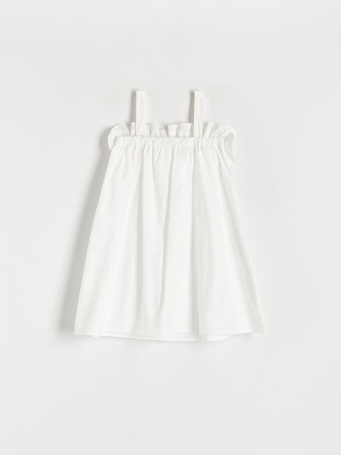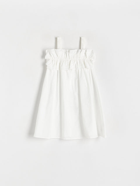 Reserved Girl's White Ruffles Dress Product description A loose-fitting dress made of cotton. square neckline wide straps decorative ruffle at the neckline Composition and care Material I : 100% COTTONMACHINE...